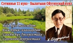 Поэт, прозаик, драматург, сахалартан биир бастакы лингвист-ученай, общественнай уонна государственнай деятель, саха советская литературатын төрүттээччи Платон Алексеевич Ойуунускай 1893 сыллаахха сэтинньи 11 күнүгэр Таатта улууһугар төрөөбүтэ.